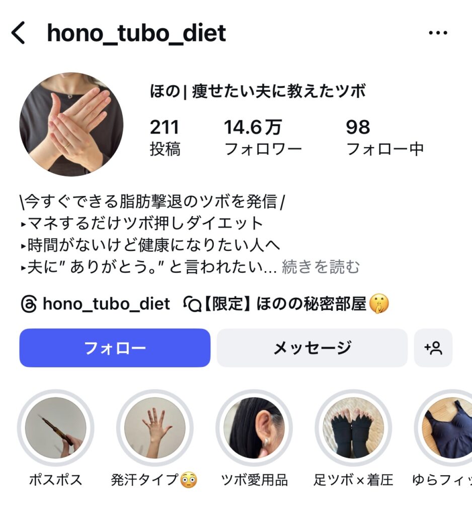 「痩せたい」「運動が続かない」という悩みに対して、解決策をツボに絞っている設計です。「夫に教えた」という切り口があり、ストーリーが想像しやすく、投稿を追いかける理由が生まれます。テーマの絞り方が機能している事例です。