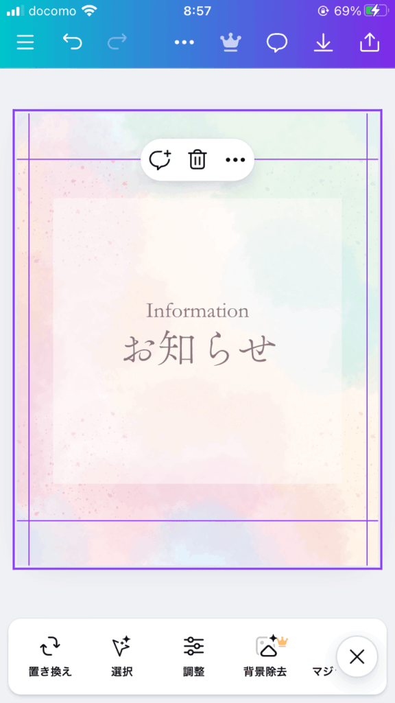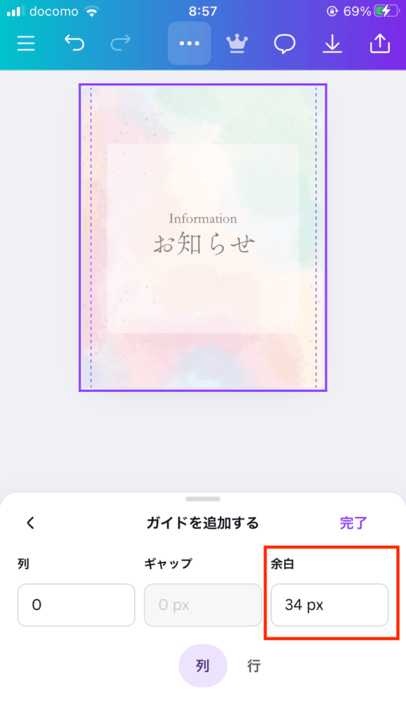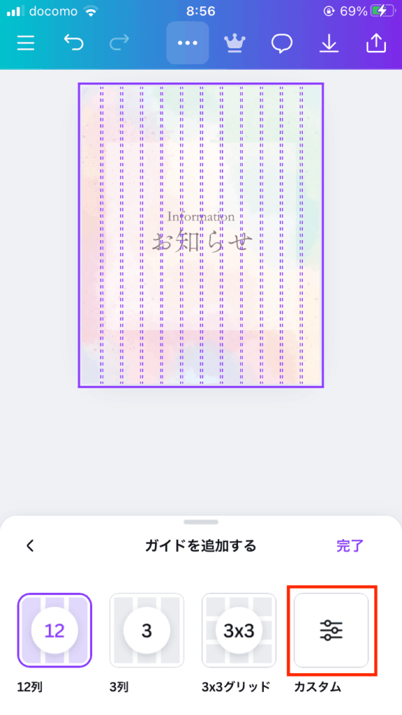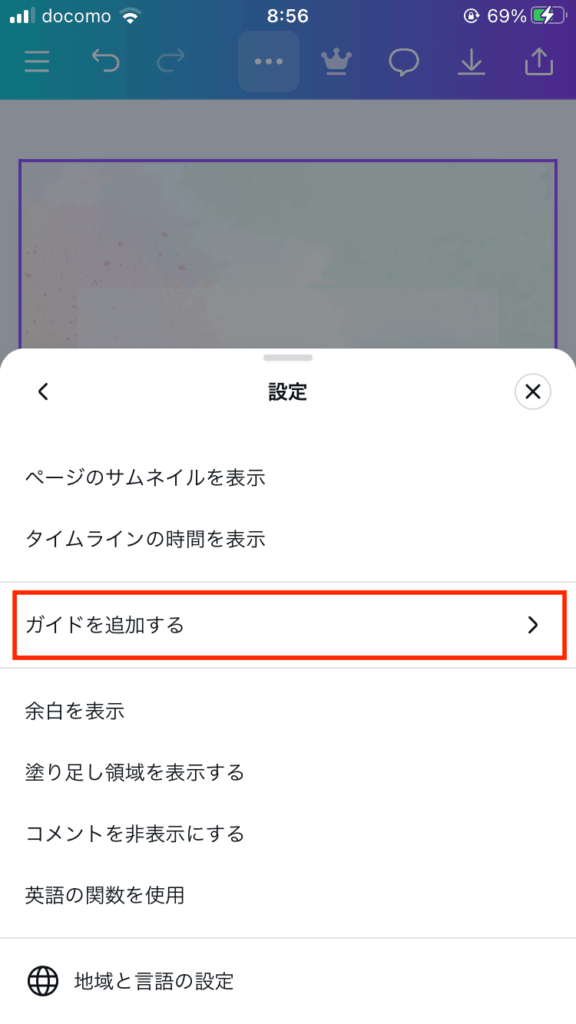 Canvaで投稿作成する際にガイドを追加する手順は、以下を参考にしてください。