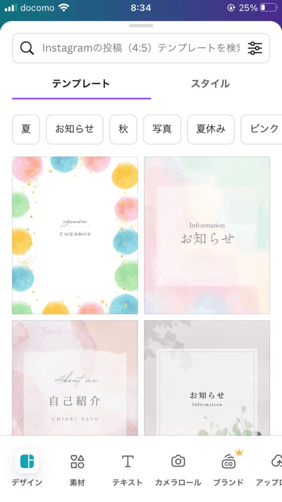 特に人気なのが「Canva」です。インスタの投稿サイズに対応しており、テンプレートも豊富なため、初心者でも使いやすいのが特徴です。ガイドも作成できるので、表示場所の違いによる見切れも防げます。