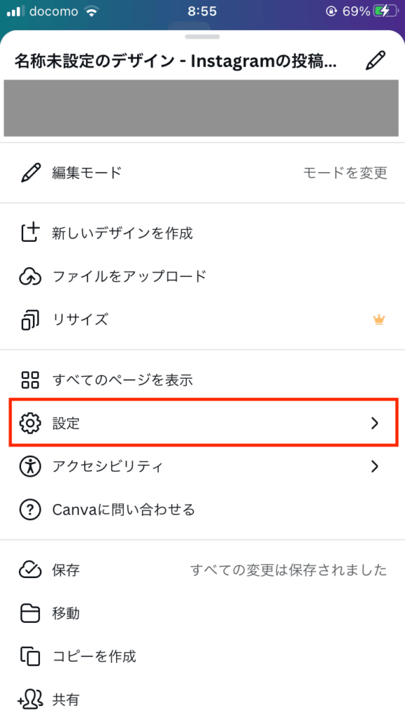 - 上部の「⋯」をタップして「設定」を開く