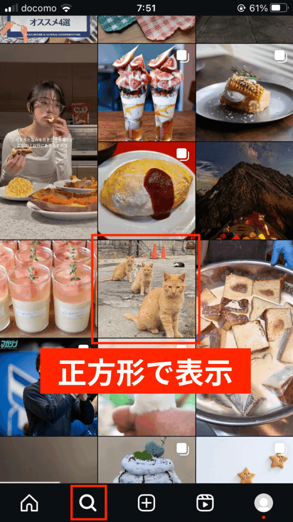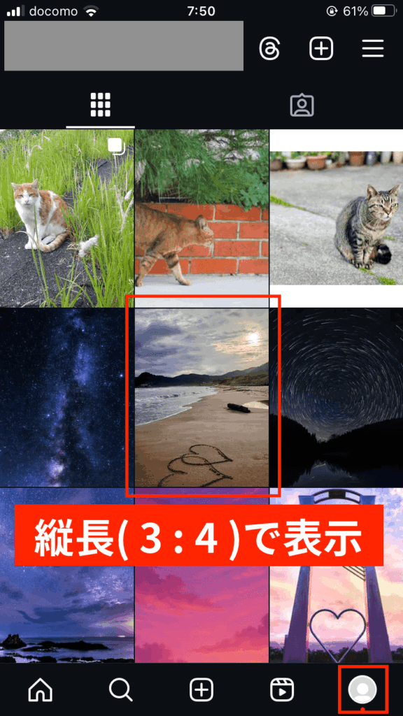 正方形でフィード投稿することもできますが、グリッド表示では縦長になるので注意してください。