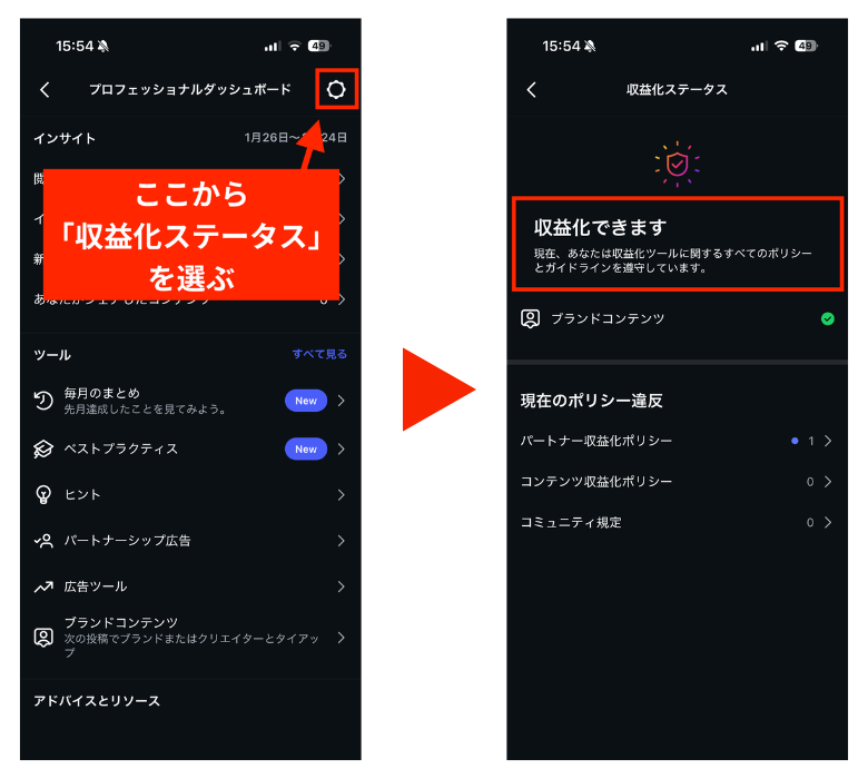 著作権侵害や不適切コンテンツがあると規約違反となり、収益化機能の利用停止につながる可能性があるので注意してください。収益化できる状態か知りたい場合は「収益化ステータス」をチェックしましょう。