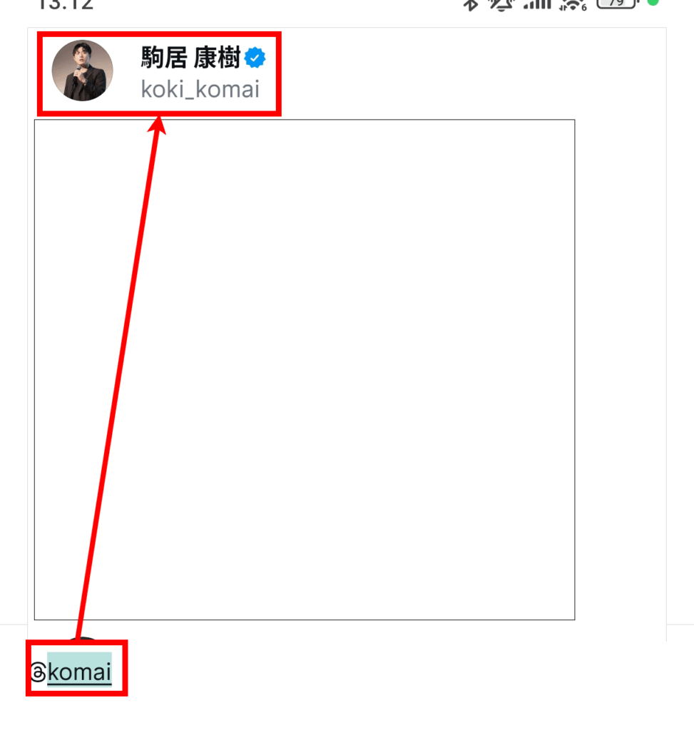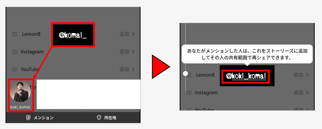 最後にメンションしたい相手のアカウントIDを記入すれば、ユーザー候補に相手のアイコンが出てきます。こちらをタップすれば、メンションは完了です。
