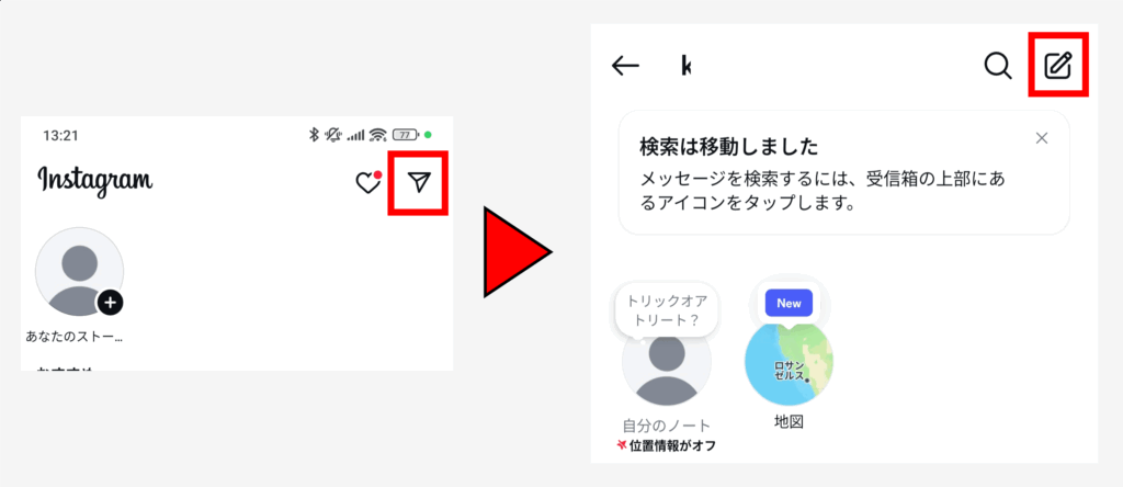 ホーム画面右上の紙飛行機アイコンから、メッセージを開いてください。そして、そのままメモアイコンから、新規メッセージ画面を開きます。