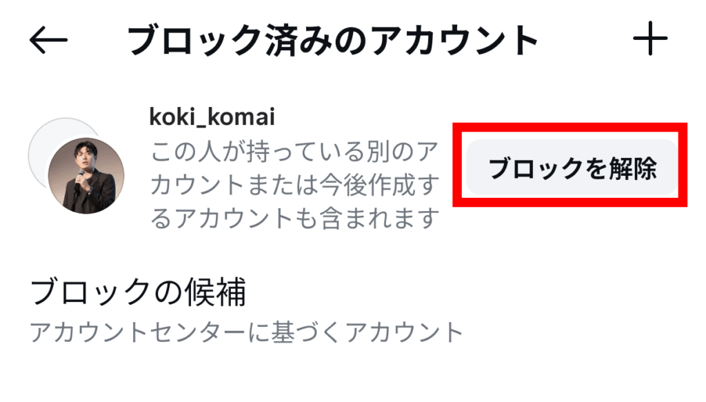 最後にブロックを解除したい相手のアカウントアイコン横にある「ブロックを解除」を押せば完了です。