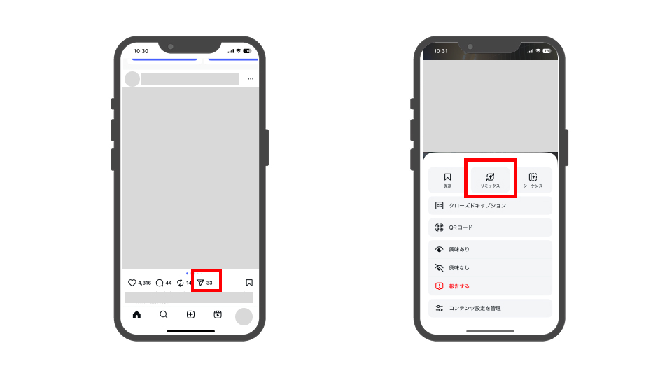 他人の投稿を紹介したい場合も、公式のシェア機能を利用しましょう。投稿の紙飛行機マークからストーリーにシェアしたり、リールのリミックス機能を活用したりするのがおすすめです。