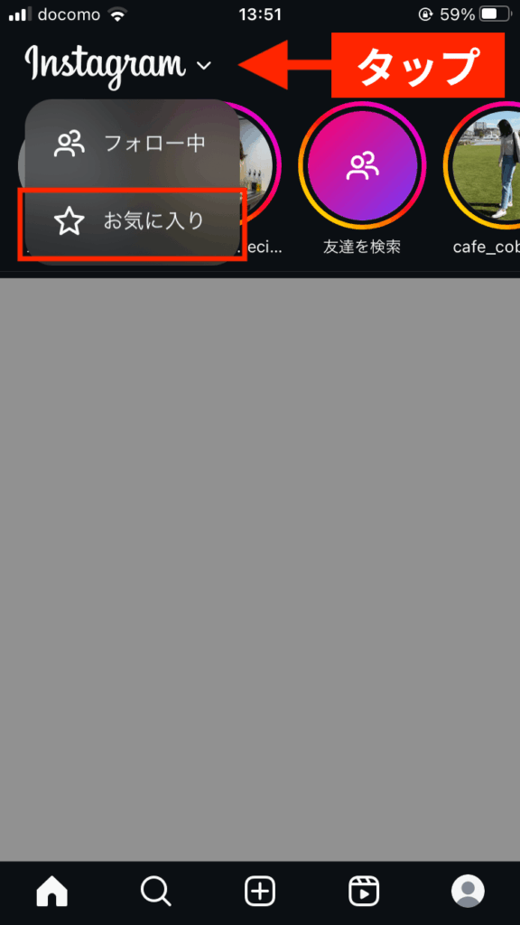 ホーム画面から「instagram」のロゴをタップし「お気に入り」を選択します。これでお気に入りリストの投稿だけのタイムラインになります。