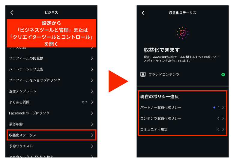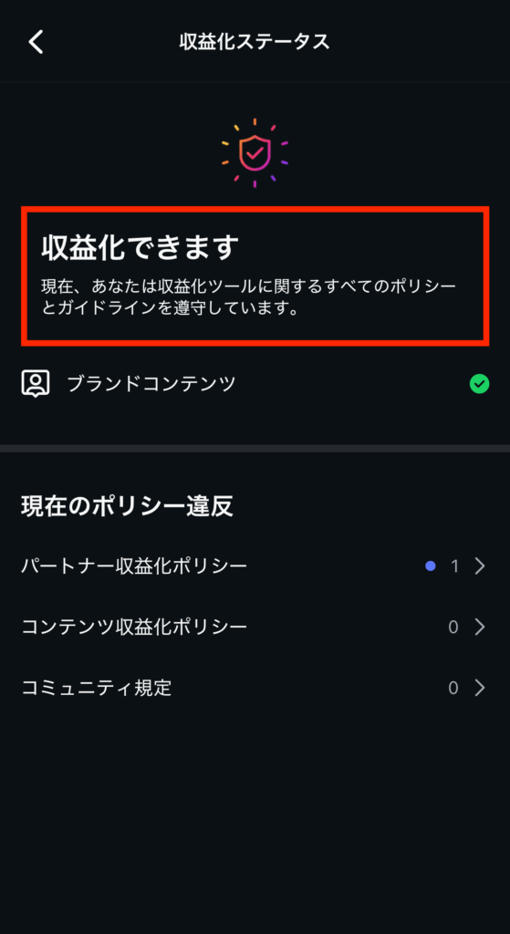 不適切な投稿や虚偽情報を発信すると、ポリシー違反により収益化が制限される場合があります。ポリシー違反の有無は「収益化ステータス」で確認できるので、チェックしてみましょう。