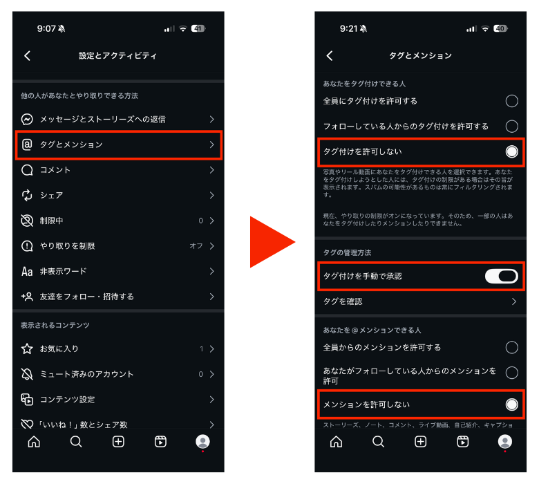 フォロー関係にない場合は投稿の内容までは閲覧されないものの、個人情報を含むユーザーネームの設定には注意しましょう。タグ付けを完全に防ぐことは難しいため、許可しない設定や手動承認をオンにするのが安全です。