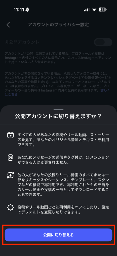 公開アカウントに戻す手順
