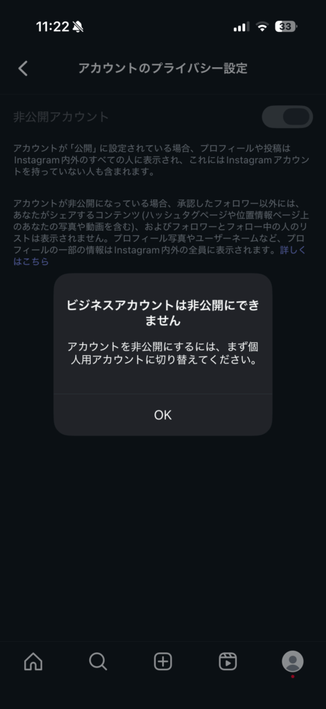 個人アカウントに切り替えることで非公開にできますが、インサイト分析や広告配信といった主要機能が利用できなくなります。新規ユーザーへのアプローチが制限されるため、ビジネス利用を想定するなら公開状態を維持するのが望ましいです。