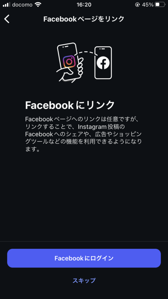 Facebookアカウントと連携しない場合は「スキップ」を選択しましょう。