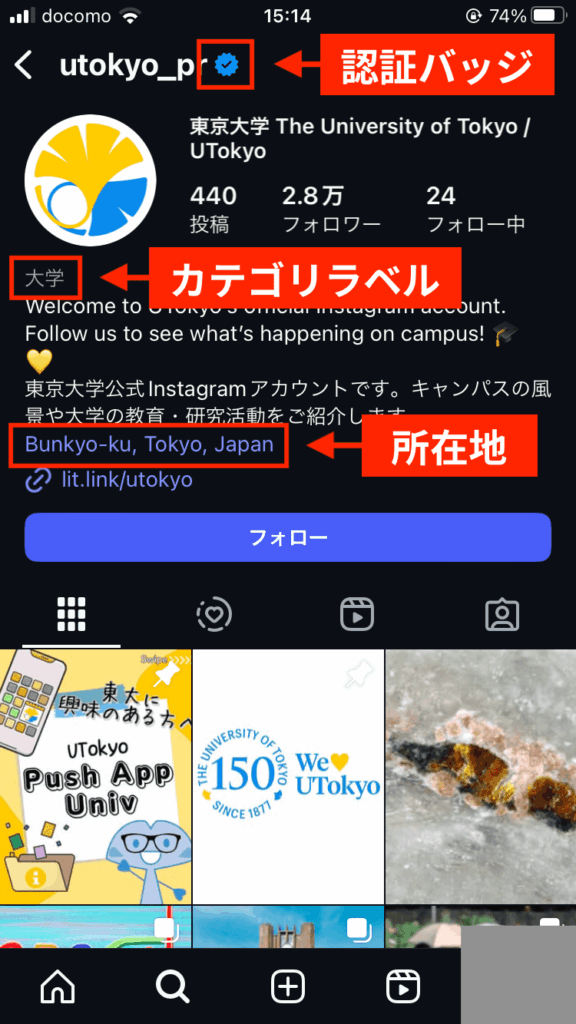 プロアカウントに切り替えると、カテゴリラベルや所在地を設定できます。さらに認証バッジを取得すれば、公式アカウントであることをアピール可能です。実在性や発信内容が一目でわかりユーザーに安心感を与えられるため、気軽にフォローしてもらえます。