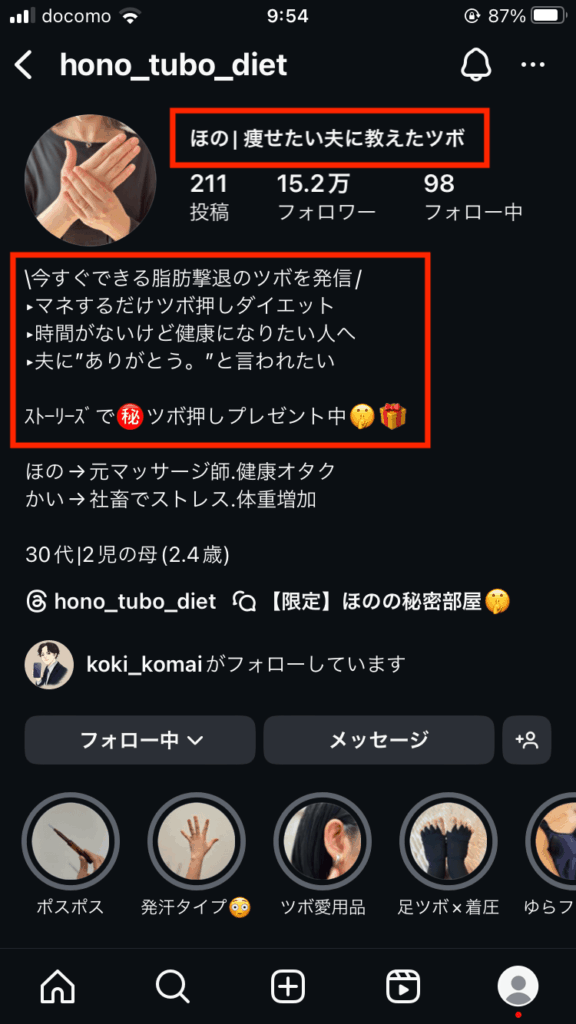 例えばほの(@hono_tubo_diet)さんは、名前欄やプロフィールに「ツボ押し」「痩せたい」「ダイエット」のキーワードを入れて、ツボ押しで痩せたいユーザーに見つけてもらいやすくしています。