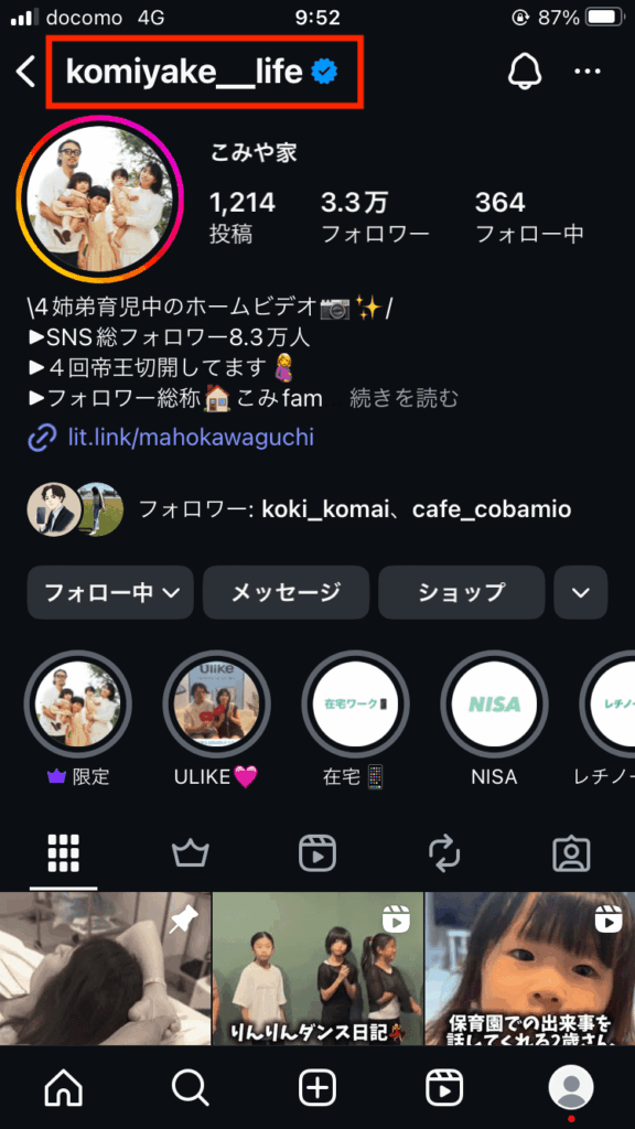例えばこみやゆうすけ(@komiyake__life)さんのように、シンプルなユーザーネームは検索しやすく、家族の発信をしていることが伝わります。