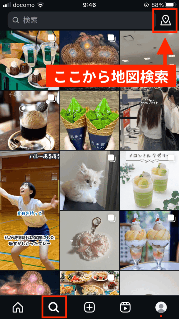 地図検索は「発見タブ」から「地図アイコン」をタップすると使えます。