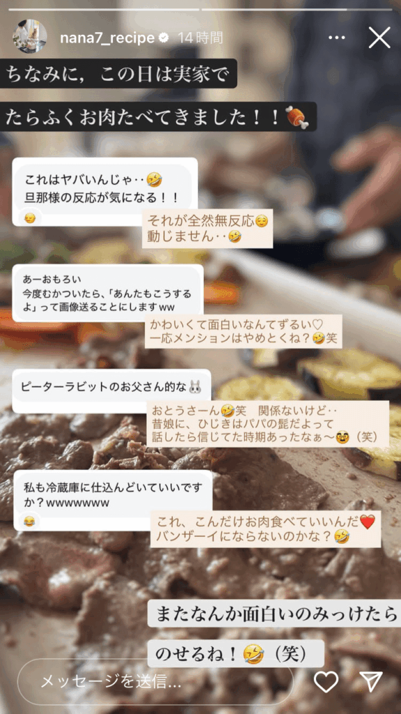 なな(@nana7_recipe)さんは、ストーリーズでコメント返信することで、積極的にフォロワーとコミュニケーションをとっています。