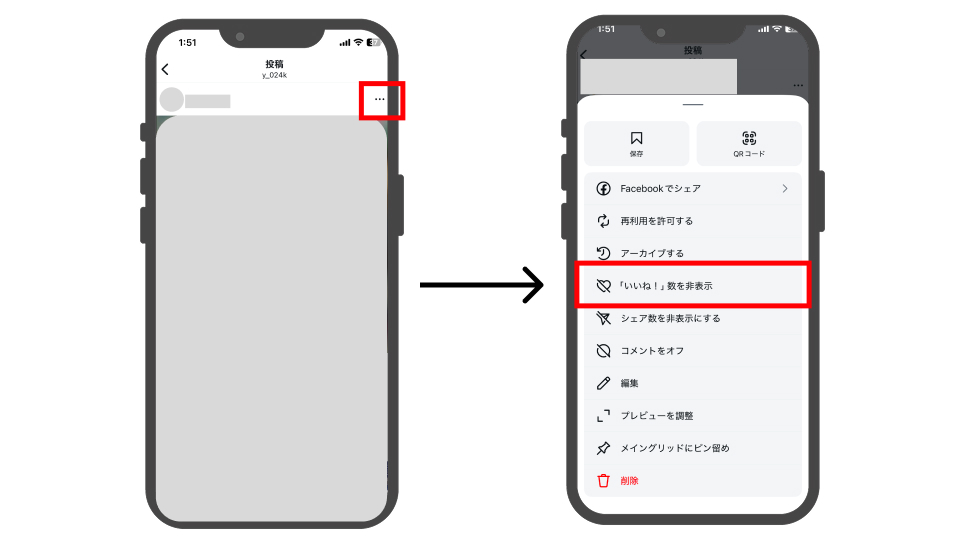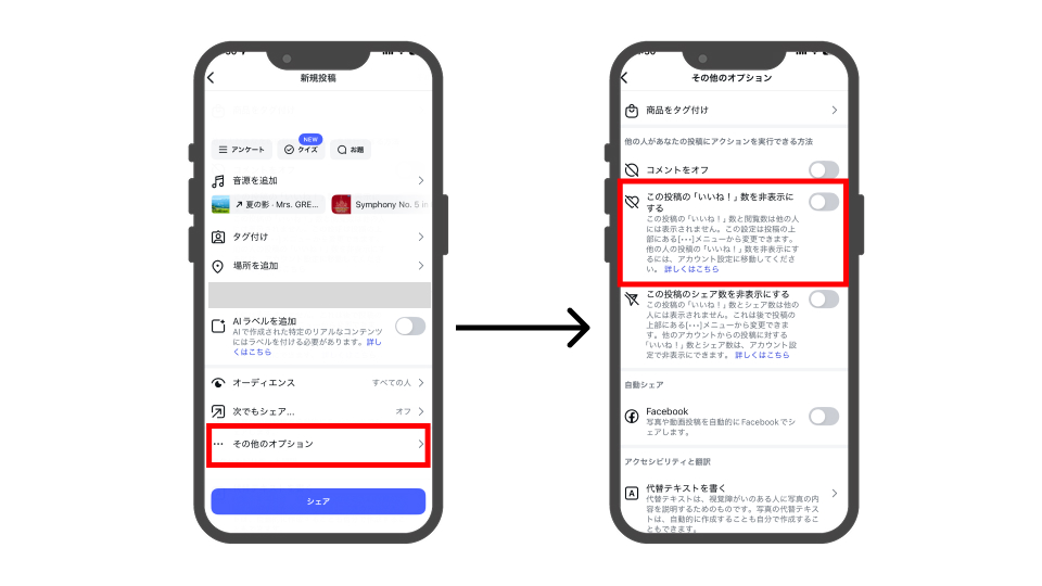 投稿のいいね数を他の人に見られたくない場合は、非表示に設定することができます。