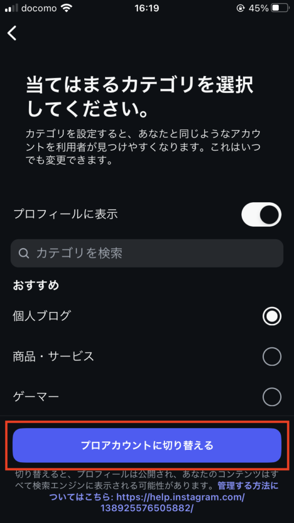 プロアカウントに切り替えると自動的に公開設定になる点に注意してください。