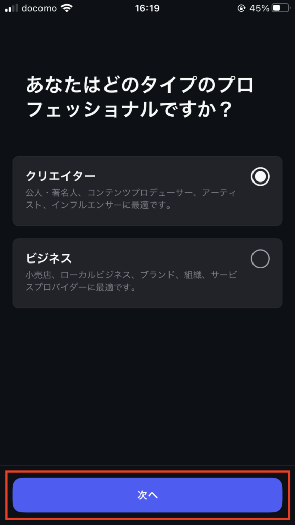 クリエイターとビジネスのどちらかを選択し「次へ」をタップする